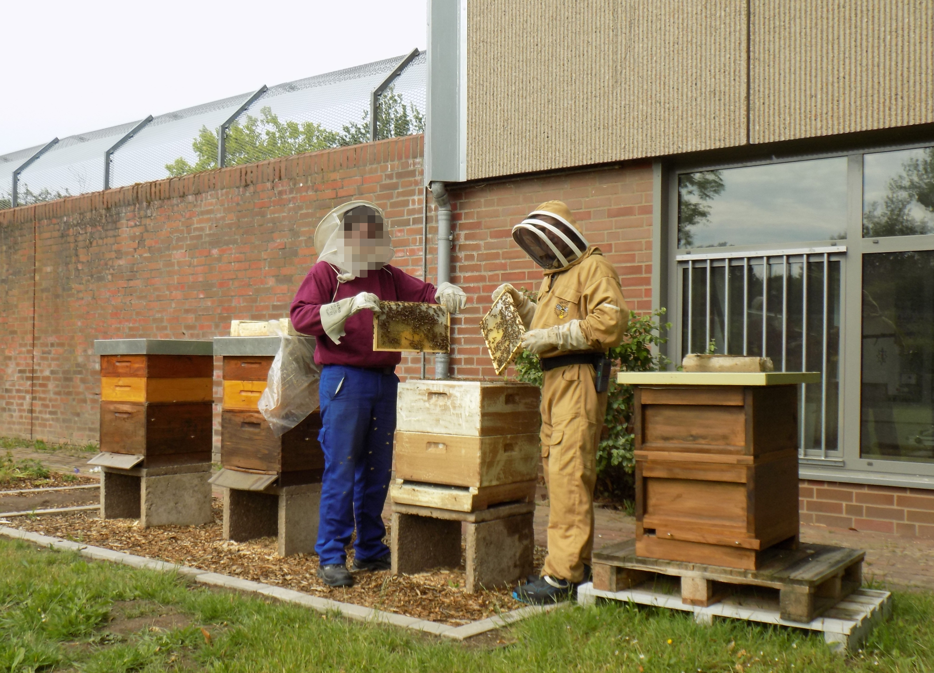 Das Imkern sensibilisiert für Umweltthemen und erzieht zur Verantwortungsübernahme. Ruhe und Gelassenheit statt Hektik und Anspannung sind gefordert und werden gefördert. Ein geringes Selbstwertempfinden hingegen und problematisches Freizeitverhalten, mit sich nichts Sinnvolles anfangen können in der freien Zeit, können Faktoren sein, die einen späteren Rückfall begünstigen. Für Justizvollzugsfachwirt Viktor Kolb, selbst begeisterter Hobby-Imker und in der Arbeitstherapie der Jugendanstalt Hameln tätig, Gründe genug, ein entsprechendes Freizeitangebot für Inhaftierte einzurichten. Das Equipment hat Kolb selber beigesteuert. Die Bienen zum Start brachte Kolbs Kollege Olaf Neitz, Chef der JA-Ausbildungsküche, mit hinter die Mauern. Inzwischen stehen vier Bienenstöcke im JA Gelände, dass mit seinen weitläufigen 20 ha ausreichend Nahrung und Betätigung für die Bienen bietet. Und nicht nur für die Bienen. Schmackhafter ‚selbstgemachter‘ Honig bereichert die Frühstückspause und die erforderliche Ausrüstung von der Beute bis zum Wabenrahmen wird in der Arbeitstherapie selber gezimmert und repariert. Nico, 20 Jahre und wegen Einbruchsdiebstahls 10 Monate in der JA, wurde langsam von Kolb an den richtigen Umgang mit den Bienen herangeführt. „Es macht einfach großen Spaß, sich um die Völker zu kümmern, dafür zu sorgen, dass es ihnen gut geht oder ihnen auch einfach nur zuzusehen“. Wie viele seiner Mitinsassen ist er früher nicht an Hobbys und sinnvolle Freizeitinteressen herangeführt worden. Jetzt steht für den jungen Mann, der nach der Haftstrafe in seinen ländlichen Heimatort im Raum Braunschweig zurückkehren wird fest: „Ich will weiter lernen und irgendwann eigene Bienen haben.“ Vermarkten wird die Jugendanstalt den Honig – „Knastgold“ im internen Jargon – übrigens nicht.