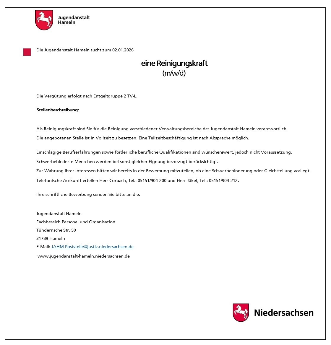 Wir suchen für den Verwaltungsbereich eine Reinigungskraft in Vollzeit