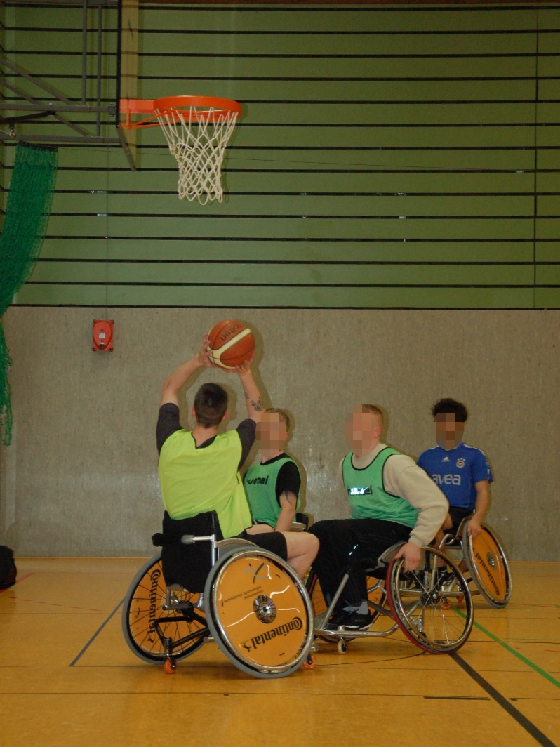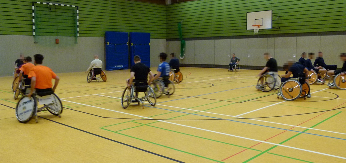 Die Bundesliga-Rollstuhlbasketballer Eike Gößling und Philip Schorp haben den Gefangenen beim Rollstuhlbasketball-Workshop alles abverlangt. Sie konnten sich ausprobieren und unter Anleitung lernen, sich in einem Rollstuhl sportlich zu betätigen.